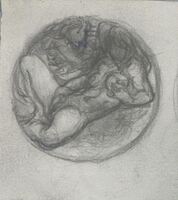 Medalla de una mujer desnuda. Boceto a lápiz de la cara de una medalla donde se aprecia la figura de una mujer desnuda, tumbada con una mano en uno de sus pechos: las piernas se contraen favoreciendo el que entren en la circunferencia de la medalla.Serie erótica realizadas para el propio medallista