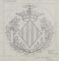 Medalla del escudo de Valencia Boceto a lápiz del reverso de una medalla representativa con el escudo de Valencia, rodeada por dos ramas de laurel remata con una corona donde encimase aprecia la figura de un murciélago con las alas abiertas.Para Acuñaciones Españolas