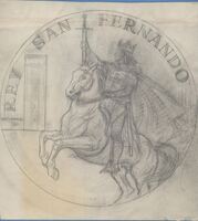 Medalla del Rey San Fernando Boceto a lápiz de la cara de una medalla con la imagen del Rey Fernando a lomos de un caballo blanco, con capa real y corona alzando su brazo en cuya mano porta una espada cogida al revés.Medalla con la leyenda "REY SAN FERNANDO" una de las caras, no tenemos referencias de su realizacion.