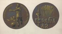 Medalla del Campeonato Mundial de Fútbol 1982 En el anverso la imagen de un jugador de fútbol corriendo tras una pelota con la figura de otro jugador en el suelo, en el reverso la imagen del edificio de Torre España en Madrid conocido como el Pirulí, con la fecha 82 y las letras Gol.
