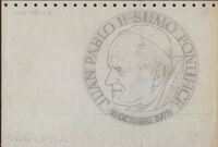 Medalla de Juan Pablo II Boceto a lápiz de una de las caras de una medalla conmemorativa del papado de Juan Pablo II, con el perfil del Papa polaco rodeado por su nombre y la fecha exacta del comienzo de su pontificado.Para Acuñaciones Españolas. Otros Archivos.: MEN/ 1792