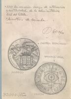 Medalla del Ministerio de hacienda Boceto a lápiz de las caras de una medalla conmemorativa del centenario del Ministerio de Hacienda, en el anverso el dibujo de un escudo con el águila imperial representando el control económico junto al reverso donde se aprecia una balanza con un gran ojo en medio símbolo de la vigilancia legal del Estado.Estudio para una futura medalla, anverso y reverso. Sin referencias.