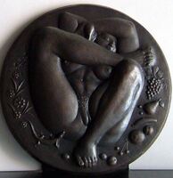 Mujer desnuda Fotografía del bajorrelieve de una medalla que representa la figura de una mujer desnuda, tumbada con las piernas abiertas mostrando sus partes más íntimas, junto a una decoración foral y frutal que rodean a la figura.
