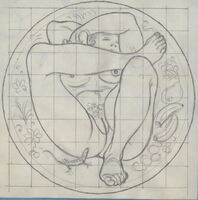 Mujer tumbada Boceto a lápiz de una medalla donde se aprecia en primer término a una mujer tumbada en el suelo semidesnuda con la falda levantada con una aptitud un poco díscola; parece representa a Lolita.