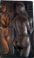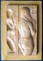 Mujer mirándose en el espejo Molde de escayola cocido donde se aprecia en primer término el cuerpo desnudo de una mujer de espaldas que se mira en un espejo mientras se recoge con sus manos el pelo, y donde se aparece en una imagen en negativo de ella mismo.