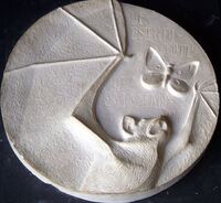 Murciélago y mariposa Molde de escayola del negativo de una medalla donde se representa a un murciélago con las abiertas y una mariposa revoloteando a su alrededor, y donde se puede leer “El estudiante de Salamanca”.
