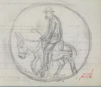 Montado en un burro, estudio realizado para la medalla sobrePlatero y Yo Boceto a lápiz de una de las caras de una medalla que representa una figura de perfil, de un hombre maduro con sombrero y bastón montado sobre el lomo de un burro., que seguramente sea don Juan Ramón Jiménez.Estudio de medalla sobre Platero y Yo, sin referencias Otros archivos: MBO/. 557-686