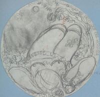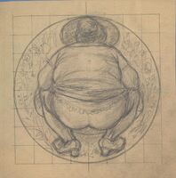 Mujer en situación comprometida Boceto a lápiz de una de las caras de una medalla donde se aprecia la figura de una mujer con un gran sombrero negro de espaldas en una situación comprometida, haciendo sus necesidades.