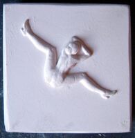 Mujer Molde de escayola donde se aprecia a una mujer con la cabeza bocabajo apoyada sobre sus manos con las piernas abiertas vista desde arriba; parece que podría ser el diseño para algún tipo de juguete.