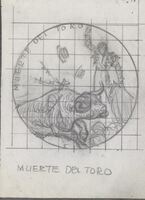 Muerte del toro Boceto a lápiz con fondo cuadriculado, de la imagen de un torero frente al toro que cae desplomado a la arena del ruedo con apuntes a lápiz del título. Los sombreros tirados al ruedo nos hablan del éxito de la faena.