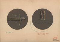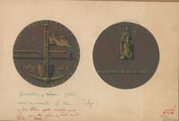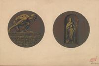 Ministerio de Obras Públicas 4 Boceto con lápices de colores de las cara de una medalla representativa del Ministerio de Obras Públicas con la imagen de Santo Domingo de la Calzada en una hornacina junto al anverso donde se aprecia la figura de un operario colocando los raíles que tienen la forma de un tren.
