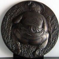Mujer en situación comprometida Fotografía del bajorrelieve de una medalla donde representa la figura de una mujer de espaldas en una situación comprometida, haciendo sus necesidades en un “escondite” en un camino.