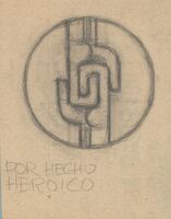 Por hecho heroico, boceto Boceto a lápiz de una de las caras de una medalla que conmemora un “hecho heroico”, tal como dice el artista, representado con la imagen geométrica –que recuerda un tanto a Chillida- de dos manos unidas.Boceto de futura medalla para el tema "Por hecho heroico. Sin mas referencias.