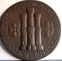Por donde hasta hoy no sabemos que haya pasado nadie Fotografía de la cara de una medalla con la leyenda en el perfil “Por donde hasta hoy no sabemos que haya pasado nadie” con la imagen de un castillo franqueado por dos escudos.