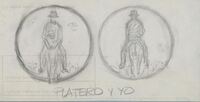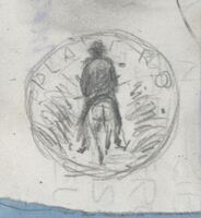 PLATERO Primer boceto a lápiz de la cara de una medalla, donde se representa la figura de un hombre con sombrero sobre un caballo, junto a unas letras en la zona superior de la medalla.bosquejo de medalla sobre "Platero". Sin referencias. Otros archivos relacionados: MBO/683-686