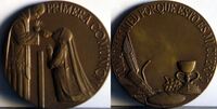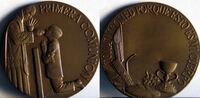 Primera Comunión Fotografía de las caras de una medalla representativa de la Primera Comunión, con la escena de un sacerdote dando a una niña de rodillas su Primera Comunión, junto al reverso donde se representan los elementos principales de la Comunión, con la frase eucarística en el perfil de la medalla.Otros archivos: Mbo/344