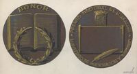 Premio Nacional de Literatura Anverso de una medalla con la imagen de un libro abierto por la mitad junto a una corona de laurel en la parte superior la palabra escrita “Honor”, al lado el reverso con un cuadro que representa quizás una placa conmemorativa con un escudo en la parte superior y en la parte inferior una pluma de escribir.SIN REFERENCIAS