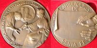 Por nuestro mandado vade a descubrir e ganar. Capitulaciones de Santa Fe -V centenario La primera medalla firmada representa a una reina dándole unos documentos a un viajero de los descubrimientos. En la segunda una mano escribe con una pluma sobre un papel. En ambas medallas, tanto en las figuras como en las palabras, destaca el alto relieve.Para Numismatica Iberica anverso y reverso, diametro: OTROS ARCHIVOS RELACIONADOS: MBO/397+438+439 MEP/1767+1768