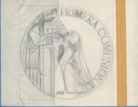 Primera Comunión 2 Dibujo a lápiz de una medalla que representa la imagen de un niño de rodillas recibiendo su Primera Comunión de manos de un sacerdote. Es posible que sea el anverso del bodegón eucarístico anterior.Dibujo del anverso para la medalla 1ª comunión (niño)encargo de Numismatica Iberica. ME/Br 1485