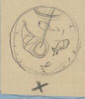 Primer boceto Primer boceto de una medalla, donde se aprecia que la forma del perfil de la pecera se adapta al borde de la medalla en cuyo interior se ve una red sujeta por un palo cerca de un pez como si quisiera capturarlo.Primeros trazos sobre un estudio para una futura medalla. Sin referencias