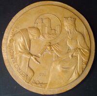 Presa de Alcántara Fotografía de los bajorrelieves de una medalla, donde en una de sus caras se aprecia la presa de Alcántara junto a la figura de Santo Domingo de la Calzada junto a unos gallos patrón de los ingenieros de caminos.