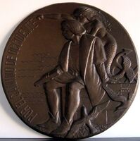 Por el camino de Occidente- V centenario del descubrimiento de América Fotografía de una medalla con la figura de Colón sentado mirando el horizonte junto a una sirena que le señala el rumbo exacto, y de cuya mano parecen salir las letras de “por el camino de occidente”.Para Numismatica Iberica, anverso. OTROS ARCHIVOS: MBO/429+383+386+394 MEN/1782+1783 MBR/1335