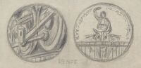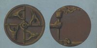 Relevo de la Antorcha Dibujo de dos medallas, la primera de ellas con la escena vista desde arriba de cuatro hombres moviendo una estructura de madera de cuatro mástiles unidos por una pieza circular que las hace girar, la segunda medalla la imagen del brazo de un hombre que porta una antorcha y otra mano que intenta cogerla en el relevo.
