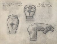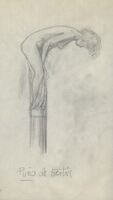 Puño de bastón 3 Boceto a lápiz del estudio de un puño de bastón donde se aprecia el dibujo de una mujer desnuda con la espalda inclinada hacia delante mientras que el resto del cuerpo forma un todo con el fuste largo donde está subida, imitando la forma de un bastón.
