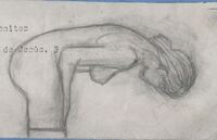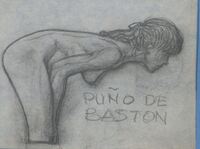 Puño de Bastón 1 Boceto a lápiz del desnudo de una mujer que se inclina sobre sus muslos creando una postura en L inversa semejante al puño de un bastón. Está dibujada sobre un papel que había sido utilizado por una máquina de escribir.