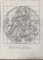 Puntillero Boceto a lápiz con fondo cuadriculado, de un de los subalternos de la cuadrilla, de espaldas al espectador, apuntillando al toro derribado sobre el ruedo. El título está apuntado abajo, también con lápiz.