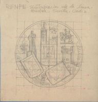 Renfe Boceto a lápiz sobre fondo cuadriculado de una medalla representativa de la líneas de RENFE, abiertas en Huelva Sevilla y Cádiz, con el conjunto de monumentos y escudo representativos de cada uno de las ciudades.