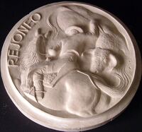 Rejoneo Fotografía de la cara de una medalla de bronce titulada Rejoneo, donde se aprecian el bajorrelieve de un hombre a caballo clavando las banderillas al toro que se divisa por detrás del caballo.realizado para la Casa de la Moneda, serie Tauromaquia,anverso. Otros archivos relacionados: MBO/561