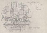 Reverso de la medalla de la Comunidad Andaluza Boceto a lápiz del reverso de la medalla conmemorativa de la Comunidad Andaluza, en primer término una calesa tirada por caballos con la imagen de la Giralda junto a unos escudos.