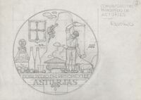 Reverso de la Comunidad del Principado de Asturias Boceto a lápiz del reverso de la comunidad del Principado de Asturias, en primer término u sidrero escanciando una botella de sidra, junto a elementos e imágenes característicos de la región.