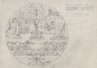 Reverso de la medalla de la Comunidad Vasca Boceto a lápiz del reverso de la medalla de la Comunidad Vasca con elementos, personajes e imágenes característicos de la región: en el centro geométrico, el árbol de Guernika.