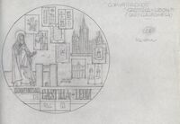 Reverso de la medalla de la Comunidad de Castilla León Boceto a lápiz del reverso de la medalla de la Comunidad de Castilla León, con la figura de Santa Teresa de Ávila junto a elementos significativos de la comunidad, como numerosos escudos.