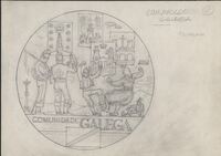 Reverso de la Comunidad Galega Boceto a lápiz del reverso de la medalla titulada la Comunidad Galega con un grupo de gallegos vestidos con trajes típicos de la región bailando junto a otra pareja de gaiteros con gaitas rodeados por escudos significativos de la comunidad.