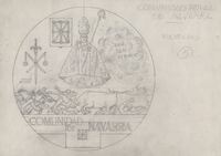 Reverso de la medalla de la Comunidad Navarra Boceto a lápiz del reverso de la medalla de la Comunidad Navarra, en primer término un encierro de San Fermín y el famoso patrono, con imágenes y elementos característicos de la región.