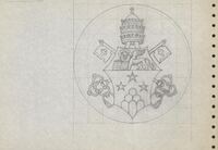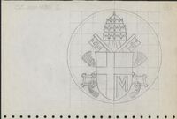 Reverso de la medalla de Juan Pablo I Boceto a lápiz sobre fondo cuadriculado del reverso de la medalla conmemorativa de Juan Pablo I, con el escudo de su pontificado coronado por la tiara papal y las llaves del Reino entregadas a San Pedro y heredadas por sus sucesores en el gobierno de la Iglesia Católica.Para Instituto Numismático. Otros Archivos.: MEN/1777 MG/1548