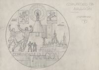 Reverso de la Comunidad de Aragón Boceto a lápiz del reverso de la medalla conmemorativa de la Comunidad de Aragón, en primer término una pareja de maños bailando una junto a la Virgen del Pilar y la Basílica del Pilar de Zaragoza más elementos significativos de la región.