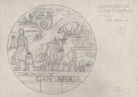 Reverso de la Comunidad Cantábrica Boceto a lápiz del reverso de la Comunidad Cantábrica representada por un vaquero ordeñando a una vaca junto a imágenes y elementos característicos de la región, ente ellas un escudo.