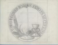 Reverso comun de la medalla 1ª COMUNION. Un Boceto a lápiz sobre fondo cuadriculado, con la imagen de los elementos eucarísticos rodeados por la plegaria eucarística. El cáliz representado es el Santo Grial de Valencia.Boceto del reverso único para la medalla de la 1ª comunion encargado por Numismatica Iberica. ME/B1484 y 1485.Img.1)