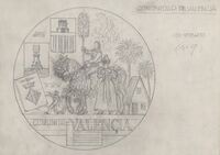 Reverso de la medalla de la Comunidad Valenciana Boceto a lápiz del reverso de la medalla conmemorativa de la Comunidad Valenciana con la figura en primer término de una fallera junto a un hombre a caballo junto a elementos significativos de la comunidad.