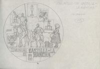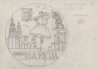Reverso de la medalla de la Comunidad de La Rioja Boceto a lápiz del reverso de la medalla conmemorativa de la Comunidad de La Rioja, con monumentos arquitectónicos elementos y bailes típicos de la región. En uno de los dibujos, un peregrino en el Camino de Santiago.