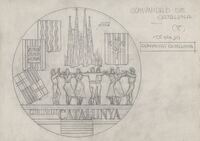 Reverso de la Comunidad Catalana Boceto a lápiz del reverso de la Comunidad Catalana con las silueta de la Catedral Barcelonesa de Gaudí, junto a un grupo de personas bailando una sardana, formando un corro y escudos de diferentes regiones de la comunidad.