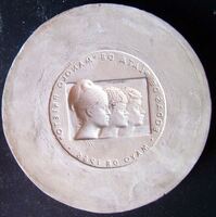 Retratos de los hijos del artista Molde de escayola de las caras de una medalla, cuya pérdida de material puede ser debido a una mala reproducción del molde con la consiguiente fracturación de las partes más frágiles, aun así se aprecia un conjunto de perfiles de los retratos de los hijos de Manolo Prieto.