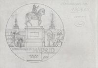 Reverso de la medalla de la Comunidad de Madrid Boceto a lápiz de la medalla del reverso de la medalla de la Comunidad de Madrid con la imagen en primer término Felipe IV junto al oso y el madroño y una pareja de chulapos bailando.