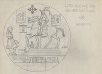 Reverso de la medalla de la Comunidad Extremeña Boceto a lápiz del reverso de la medalla conmemorativa de la Comunidad Extremeña, con la figura ecuestre de Pizarro a caballo junto elementos significativos de la comunidad.