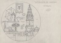 Reverso de la Autonomía Murciana Boceto a lápiz del reverso de la Autonomía Murciana, con elementos arquitectónicos y gastronómicos típicos de la región, como la torre de la Catedral o un joven adentrándose en el Mar menor.