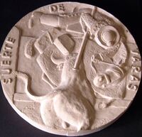 Suerte de Varas Molde de escayola del positivo de una medalla que representa la escena taurina, vista desde arriba, de un picador sobre su caballo castigando con su pica al toro. Pueden leerle las letras: “Suerte de Varas”.